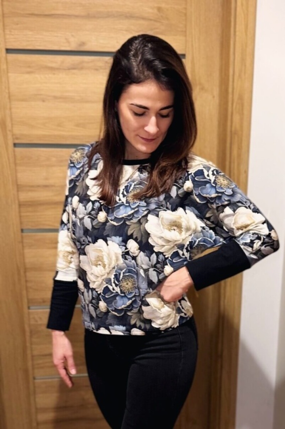 Bluzka AURA quiet garden to zaproszenie do zwolnienia tempa. Stonowane odcienie szarości i granatu, kwiatowy print oraz czarne wykończenia tworzą harmonijną całość — spokojną, ale wyrazistą.