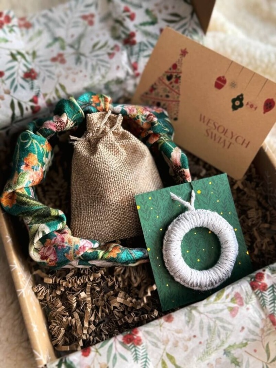 Pleciona ręcznie z bawełnianego sznurka ze złotą nitką, subtelnie odbija światło (do garderoby, do auta, na choinkę). Woreczek z naturalnym lnem i polską lawendą przypomina, że czas dla siebie to nie luksus, tylko potrzeba.
