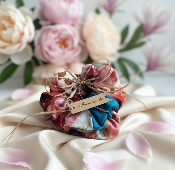 Kwiatowa, pełna ciepłych tonów – jak ogród o poranku. Uszyta w duchu less waste z tkanin, które zostały po szyciu kolekcji. Każda gumka to unikat, bo każdy skrawek ma swoją historię.