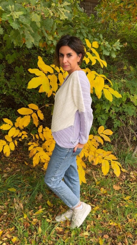 Jego lawendowy ton przynosi ukojenie, a ecru łagodzi każdy dzień. To duet, który pasuje do miękkiego światła poranka i jesiennej kawy wypitej w ciszy. **Kopertowy krój** subtelnie podkreśla sylwetkę, a **kimonowy rękaw** i opadające ramię dodają nonszalancji — takiej, która nie potrzebuje udowadniania niczego nikomu.